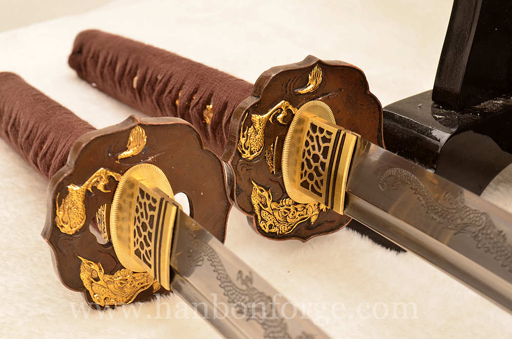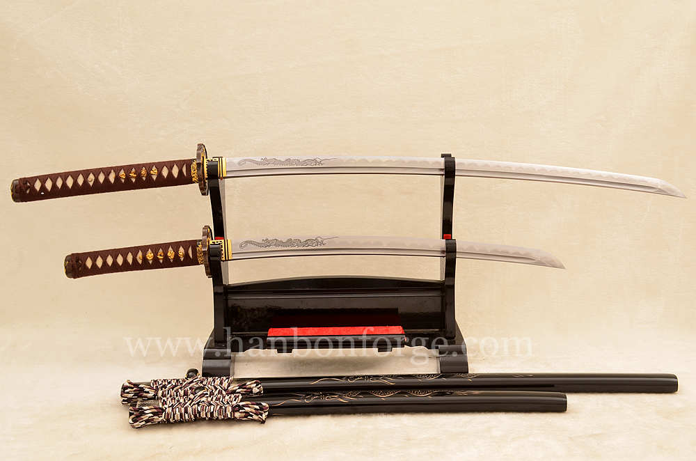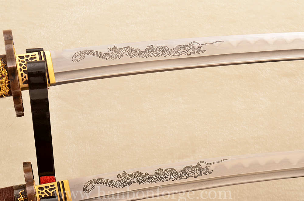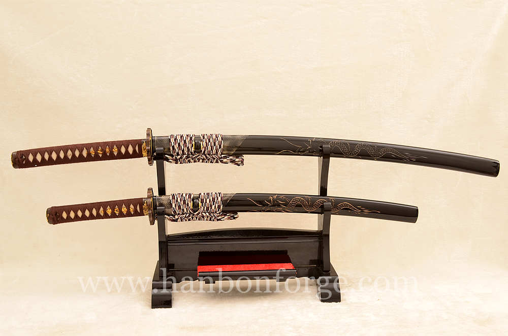 This is a sword set which including Katana and wakizashi. This sword set was customized made for our Australia customer. The two blades are GYAKU-KOBUSE construction. The blades were constructed from two different kinds of steel, the core steel and the outer steel, where the core steel is wrapped with the outer steel. The core steel is harder than the outer steel. The outer steel was made of folded steel. It was folded 13 times creating 8192 layers for superior strength and flexibility. The visible tenuous undulating grain on the blade was resulted from folded repeatedly during forging. The core steel was made of 1095 steel. Two blades have been clay tempered and hazuya polished. Each blade has long HI(blood groove), and two swords were engraved dragon pattern on the blades and saya(sheath). Kobuse steel blade is very strong for cutting trees. Here below are detailed specifications of the two swords.